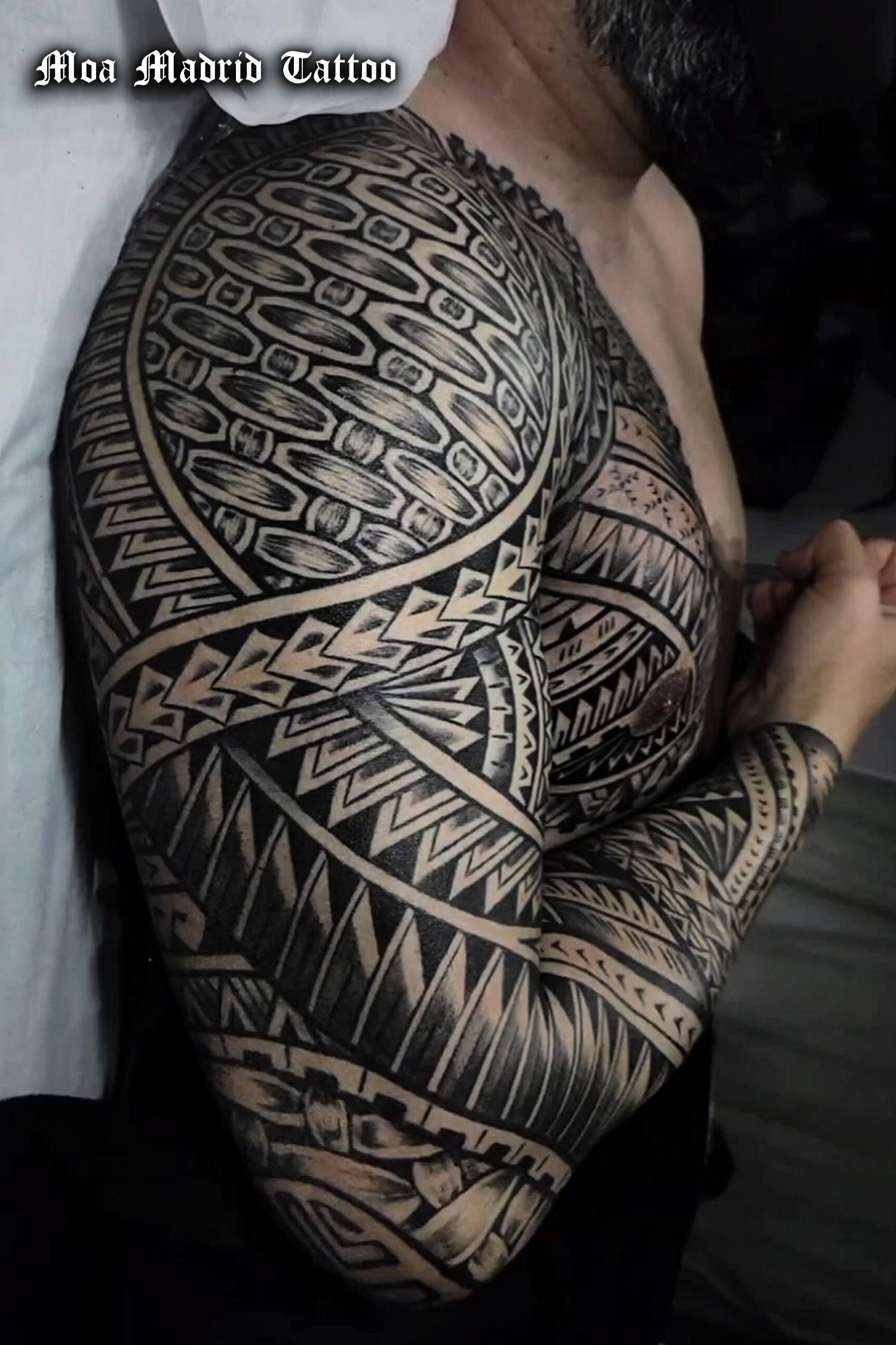 Tatuaje en todo el brazo y pectoral estilo samoano para Eliseo.