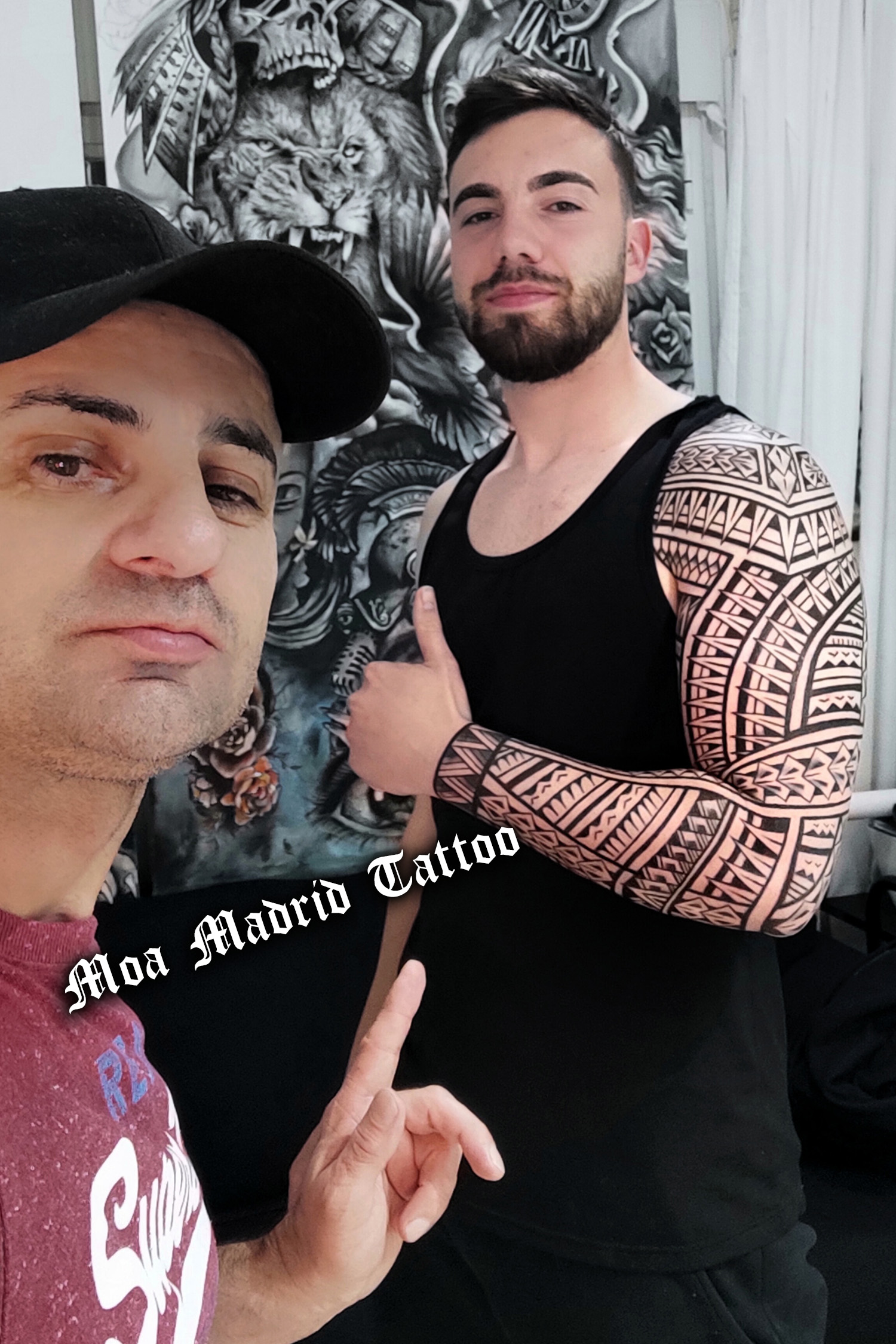 Sergio viene desde Granada para hacerse este tatuaje samoano de brazo entero en mi estudio de Madrid.