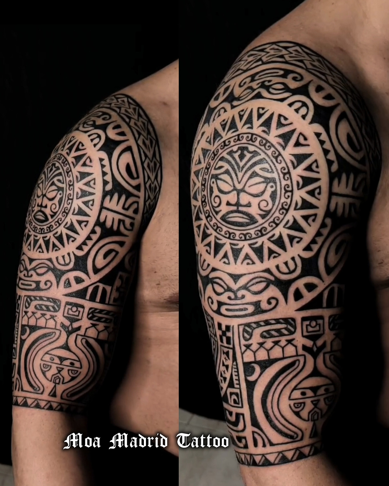 Tatuaje maorí de hombro a codo, diseño exclusivo con sol.