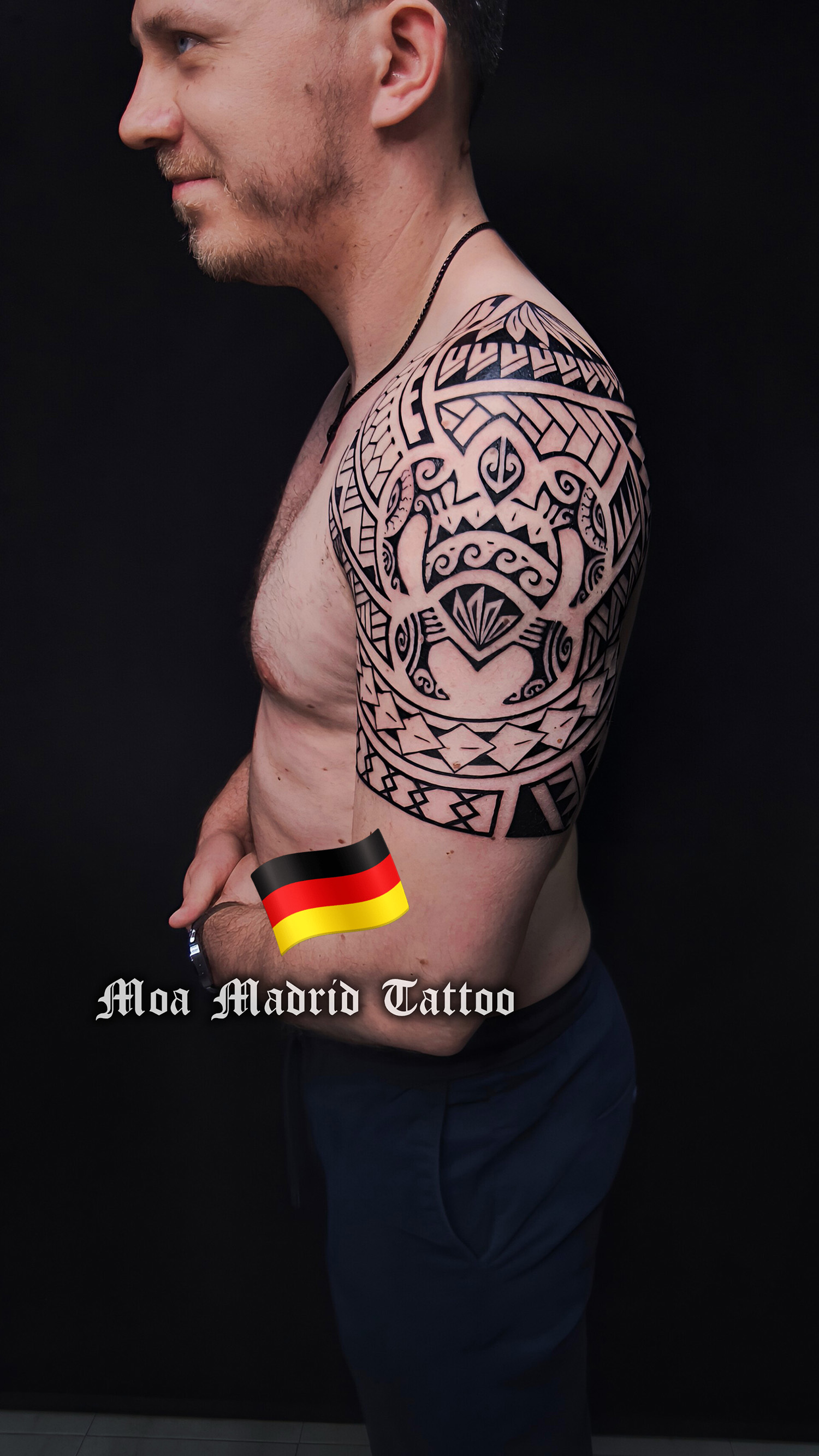 Tatuaje polinesio en el hombro con una gran tortuga para un cliente de Alemania en mi estudio de Madrid.